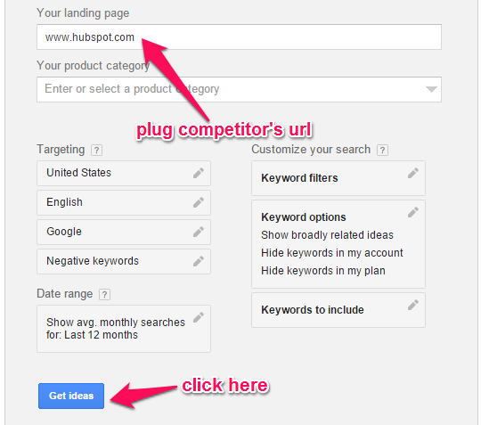 Paste your target competitor’s website URL and click the ‘Get ideas’ button at the bottom.