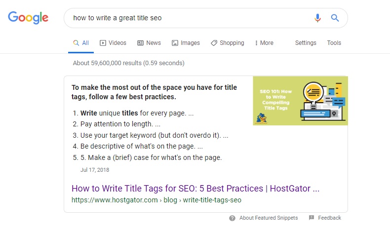- Freshness. Readers don’t want outdated information, so throwing a date into your title tag might help (ex: Best SEO Tips for 2019).