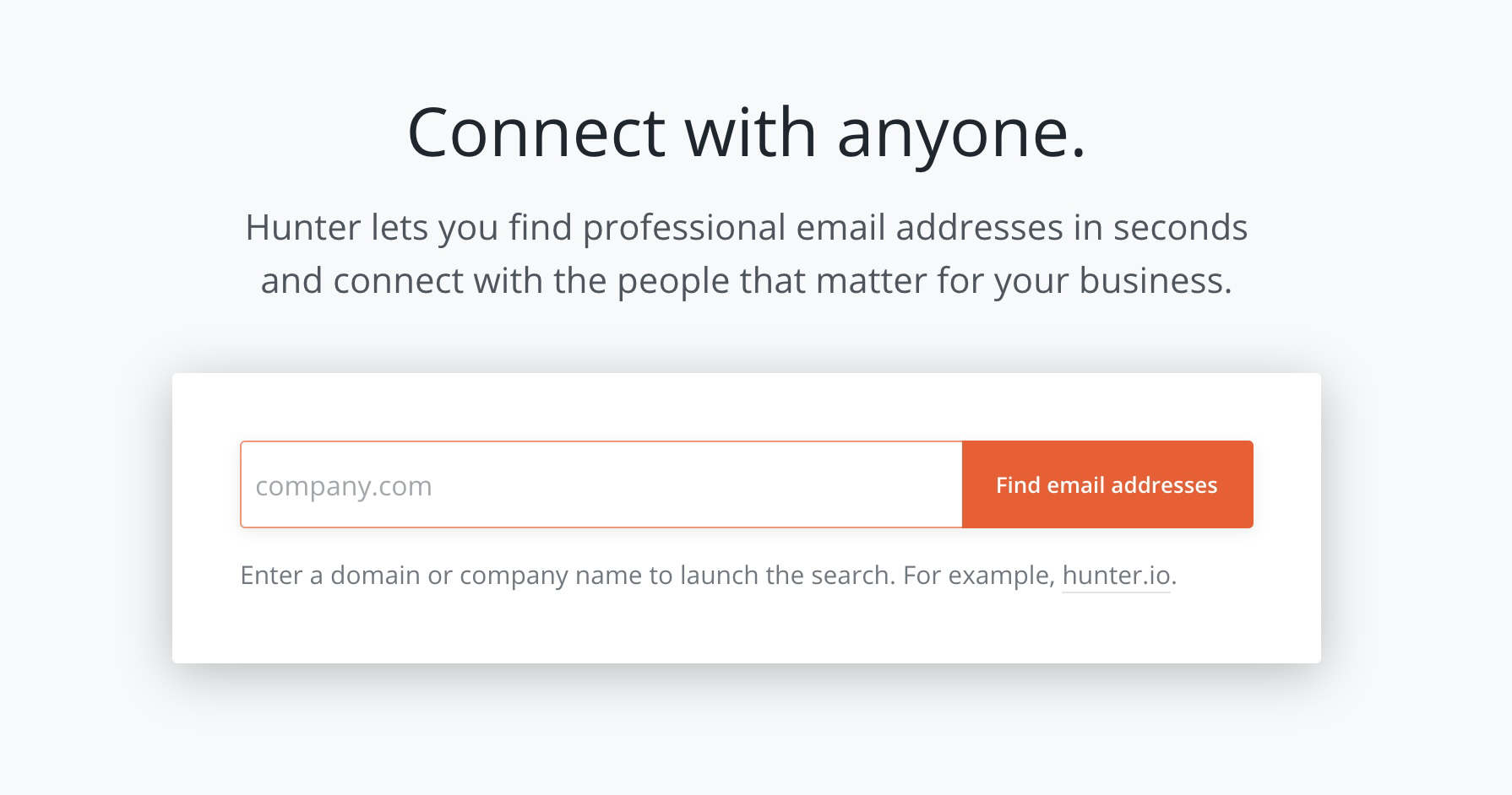 Hunter.io is a tool that helps users find email addresses and other contact information for people and companies. It allows users to search for email addresses by domain name, company name, or individual name.