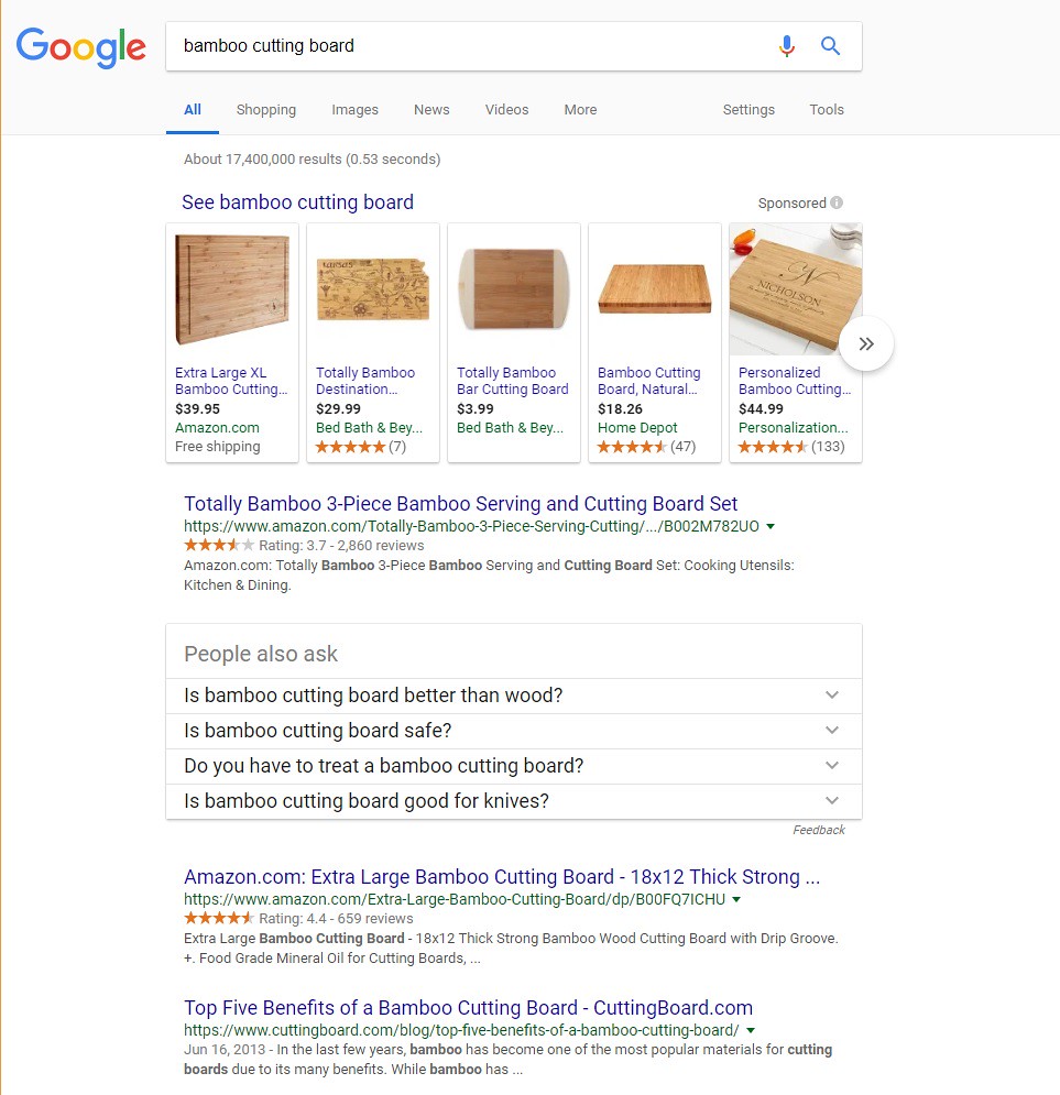 One way to identify keywords with high value is to simply type in the words that describe your products into Google and see what comes up. You’ll be able to see how other retailers are advertising their products to get some ideas. You should also check the related search queries at the bottom of the page. You can do a similar thing on Amazon if you want to avoid purely information sites entirely.