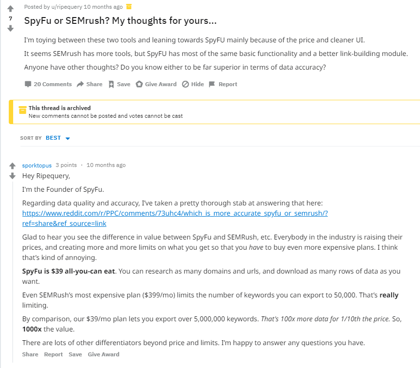 In the above image, you can see SpyFu’s CEO coming in on Reddit and answering the question. Not only the Reddit users appreciate this gesture, but this might also have resulted in a few sales, backlinks, and free traffic to their site.