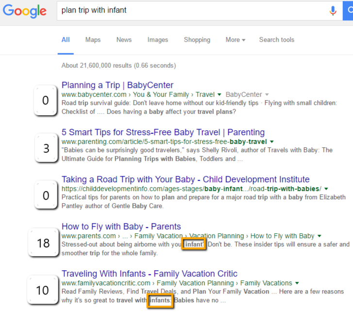 As you can guess, the user’s intent is to find tips on planning a trip with an infant. However, the first result in Google’s search engine results page does not even use the word “infant.”