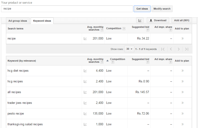 - Google Keyword Planner — Although the Google Keyword Planner is primarily used for finding keywords for ads and determining competition and bid amount, you can also use it for finding relevant related keywords in the ‘Keyword (by relevance)’ section.
