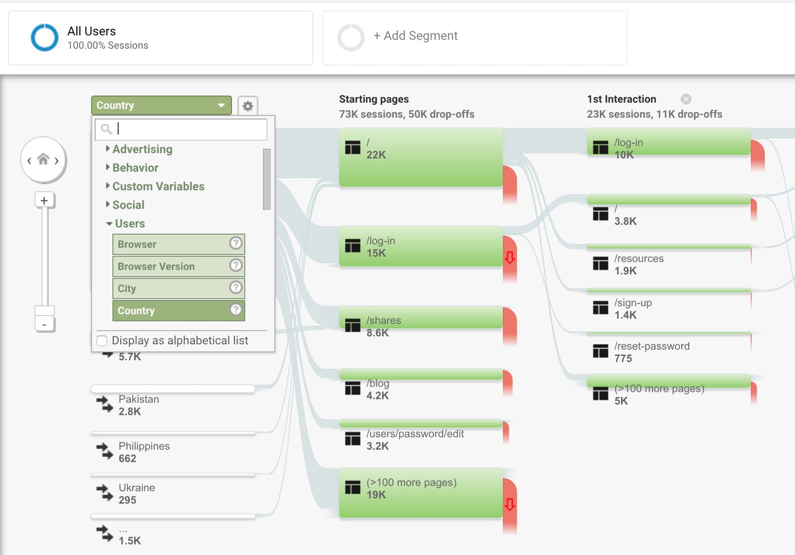 One important point to note here is that you can select different dimensions at the top-left corner of the User Flow screen to filter users based on language, browser, location, mobile devices, etc.