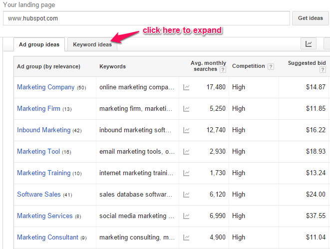 Click the ‘Keyword ideas’ tab to reveal your competitor’s best and most important keywords. Since it is the Google Keyword Planner, you would also be able to see the search traffic volume and the level of competition for each keyword.