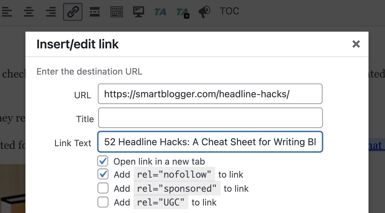 In this method, simply click on any (dofollow) hyperlink. You’ll see several options to add to your link. To make your link nofollow, tick the Add rel=”nofollow” checkbox to make the link nofollow.