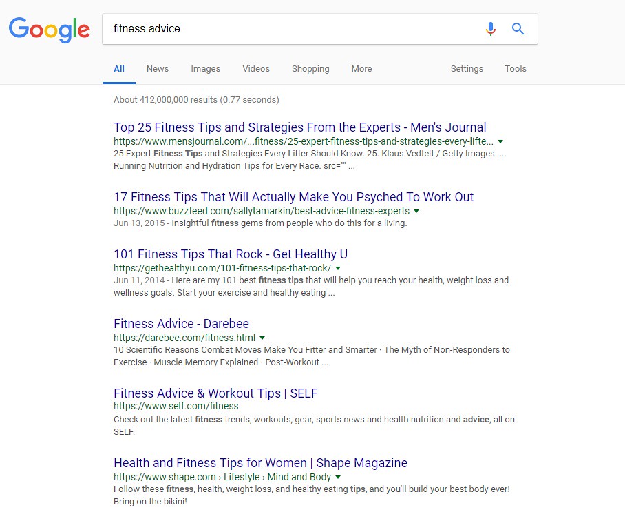 Using “fitness advice” as an example, a long-tail keyword would be a string of words you put into the search bar to find specific information. If you think about it, people probably aren’t going to be searching for general fitness advice anyway – they’ll be looking for advice about specific fitness topics such as exercise motivation tips or the best workouts to burn fat.