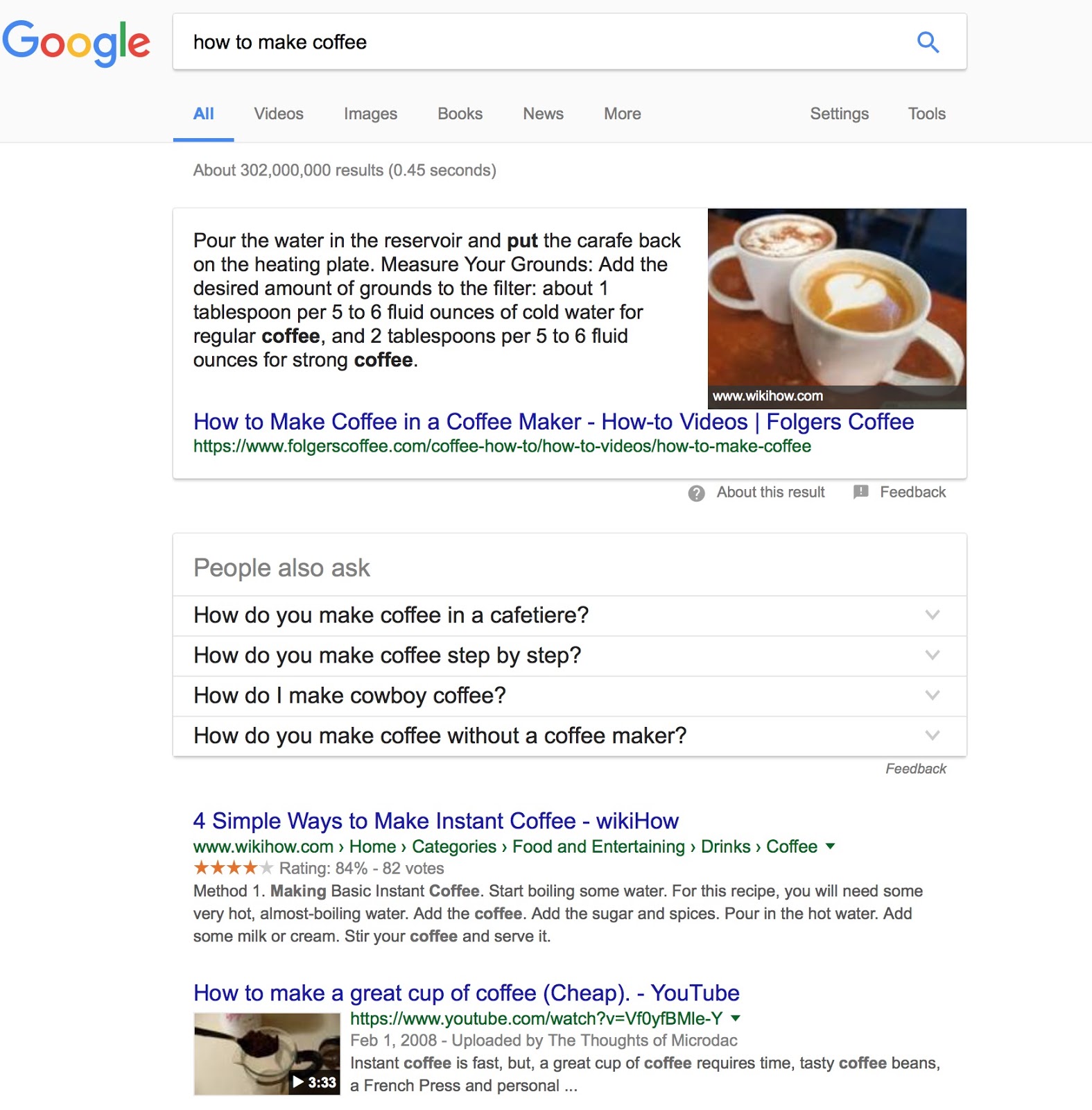 Based on that search query, the search engine crawlers search the entire web and come up with a list of the best and most relevant results. For instance, here is an example of the search engine result page for the keyword ‘how to make coffee’.